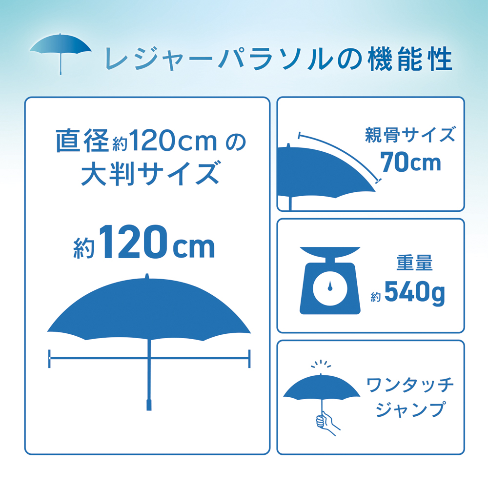 大きめサイズで日差しや暑さを軽減。手元は握りやすいグリップ形状で、スポーツや野外イベントにもおすすめです。丈夫で軽い耐風仕様。